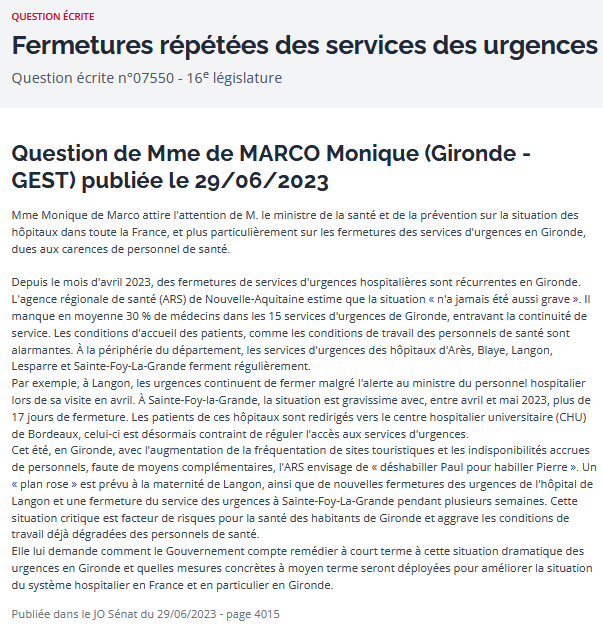 J’ai interrogé le ministre de la santé et de la prévention sur la situation des hôpitaux dans toute la France, et plus particulièrement sur les fermetures répétées des services d’urgences en Gironde.