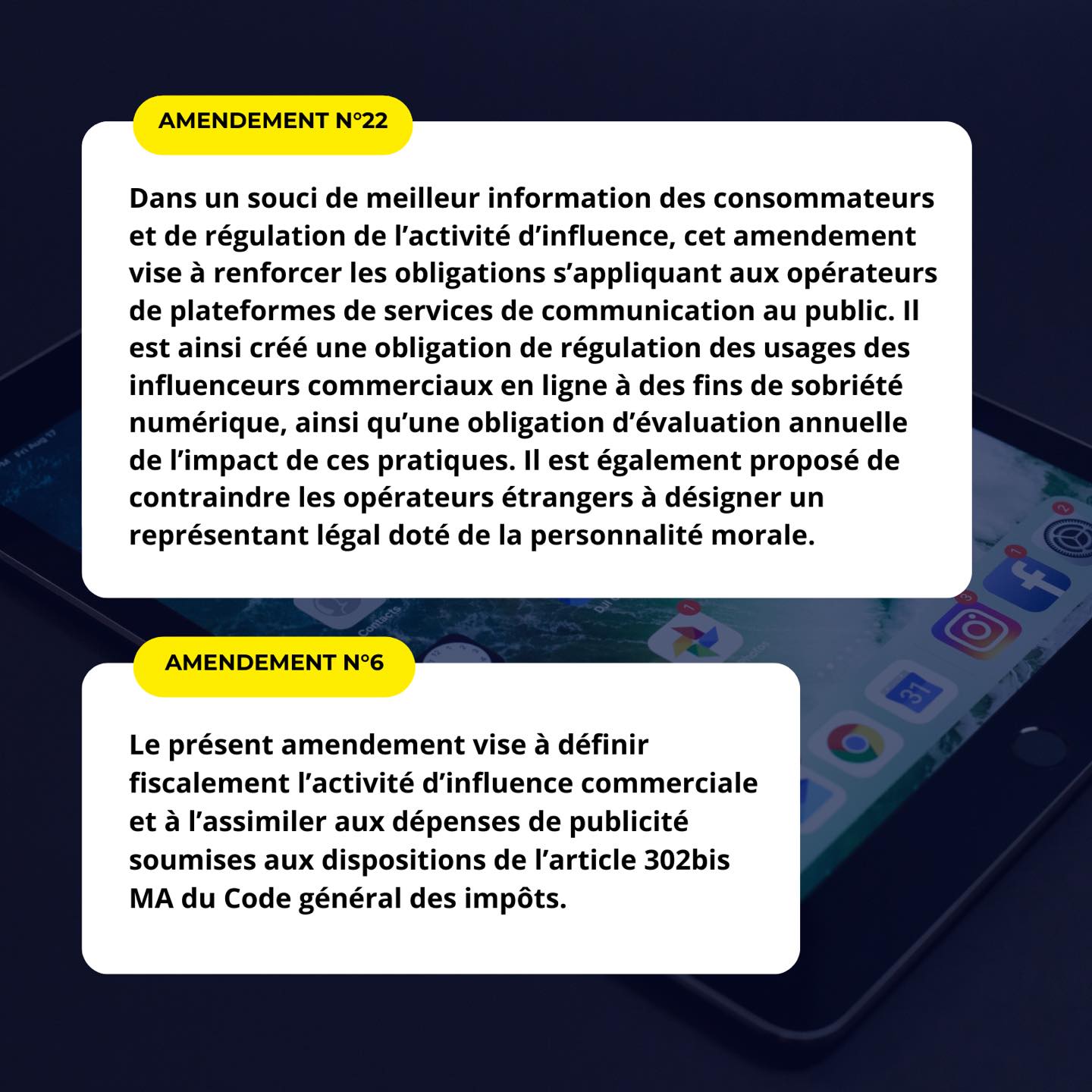 Lors du Projet de Loi de Finances 2023, j’avais déjà déposé un amendement pour taxer les placements de produit sur les réseaux sociaux. Cet amendement visait à instaurer une taxe de 5% sur la publicité en ligne relayée par les créateurs de contenus à forte exposition médiatique sur les réseaux sociaux (« influenceurs »).